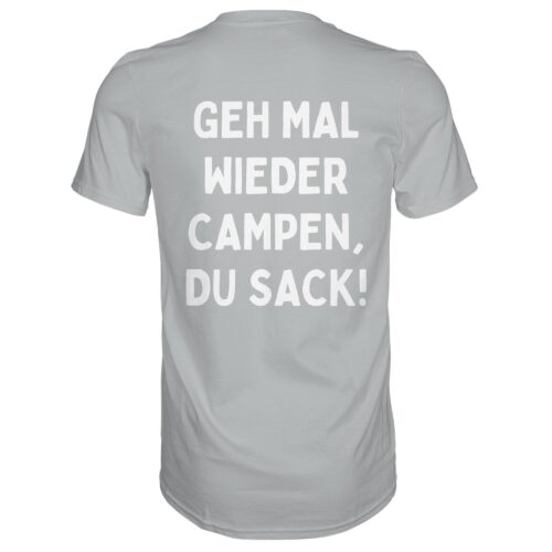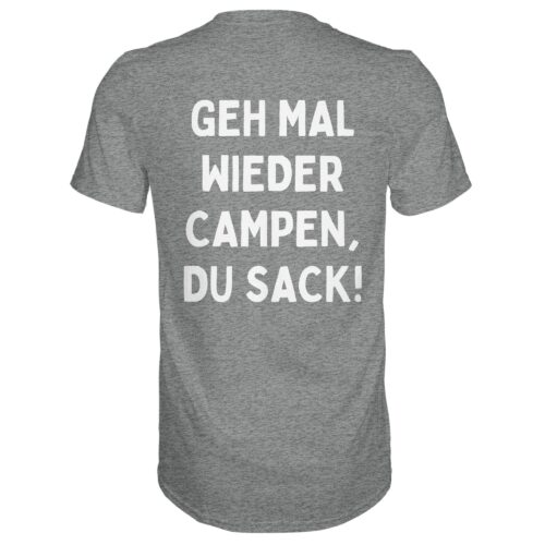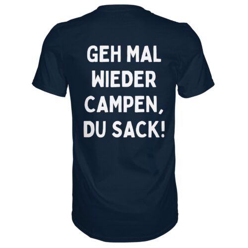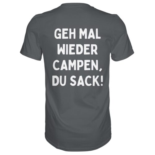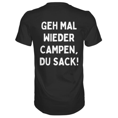 Geh mal wieder Campen, du Sack! (Rückendruck) – Premium T-Shirt Unisex